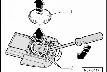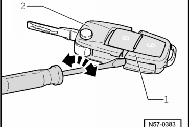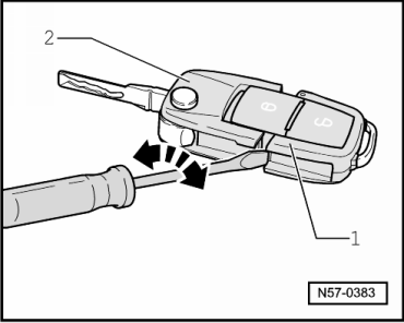 Įkiškite atsuktuvą į angą tarp radijo korpuso -1- ir rakto -2-.
