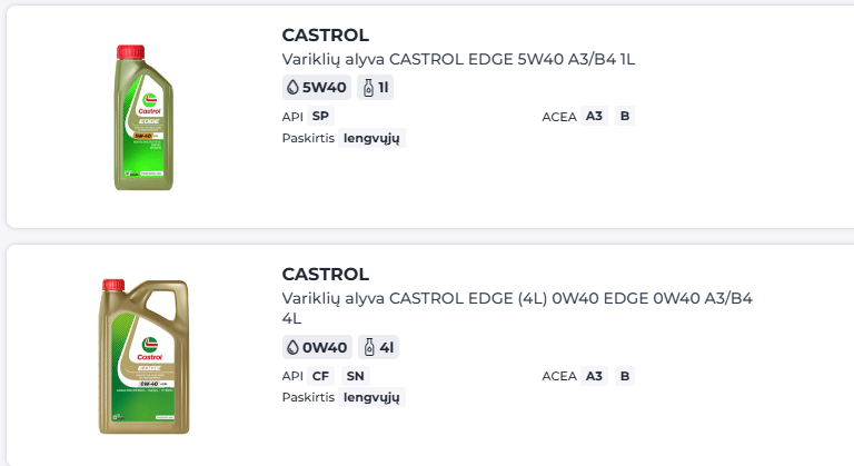 Benzinui: 5W40 ir 0W40 / Dyzeliui: 5W40